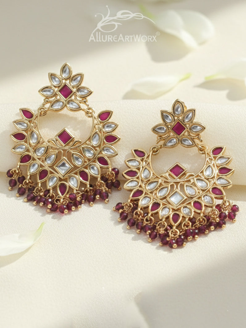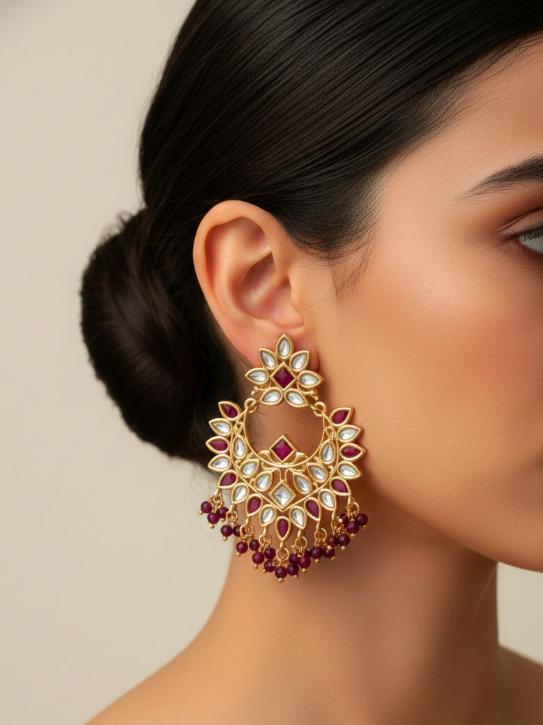 This earrings in kundan,dark pink stones and yellow gold plating can be worn on traditional outfits