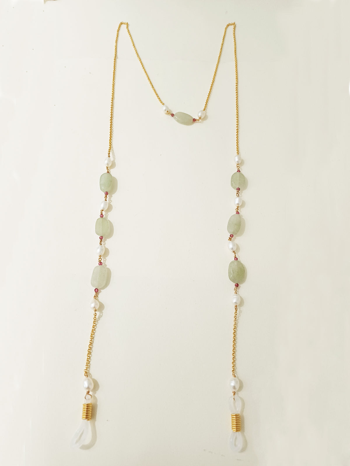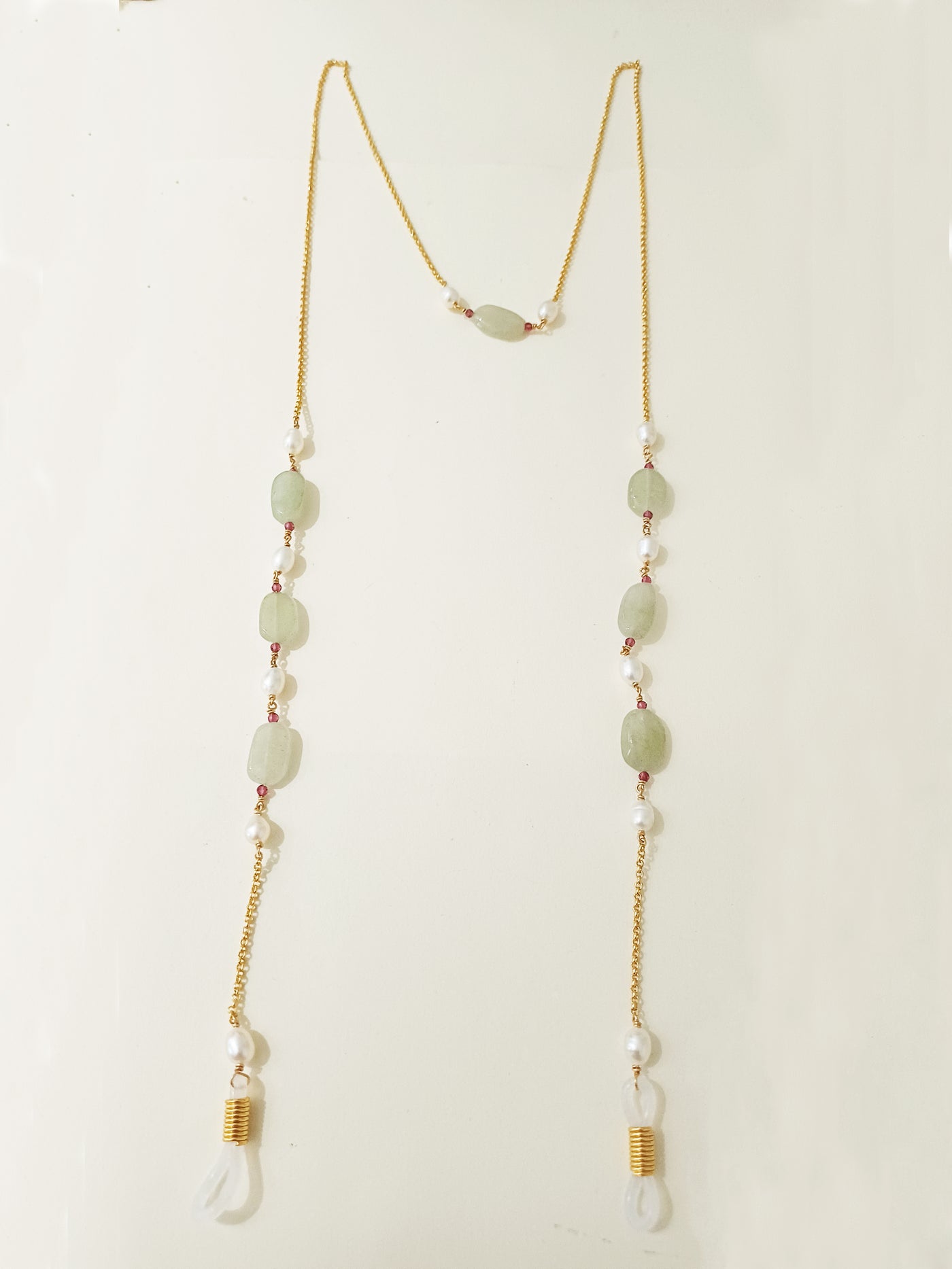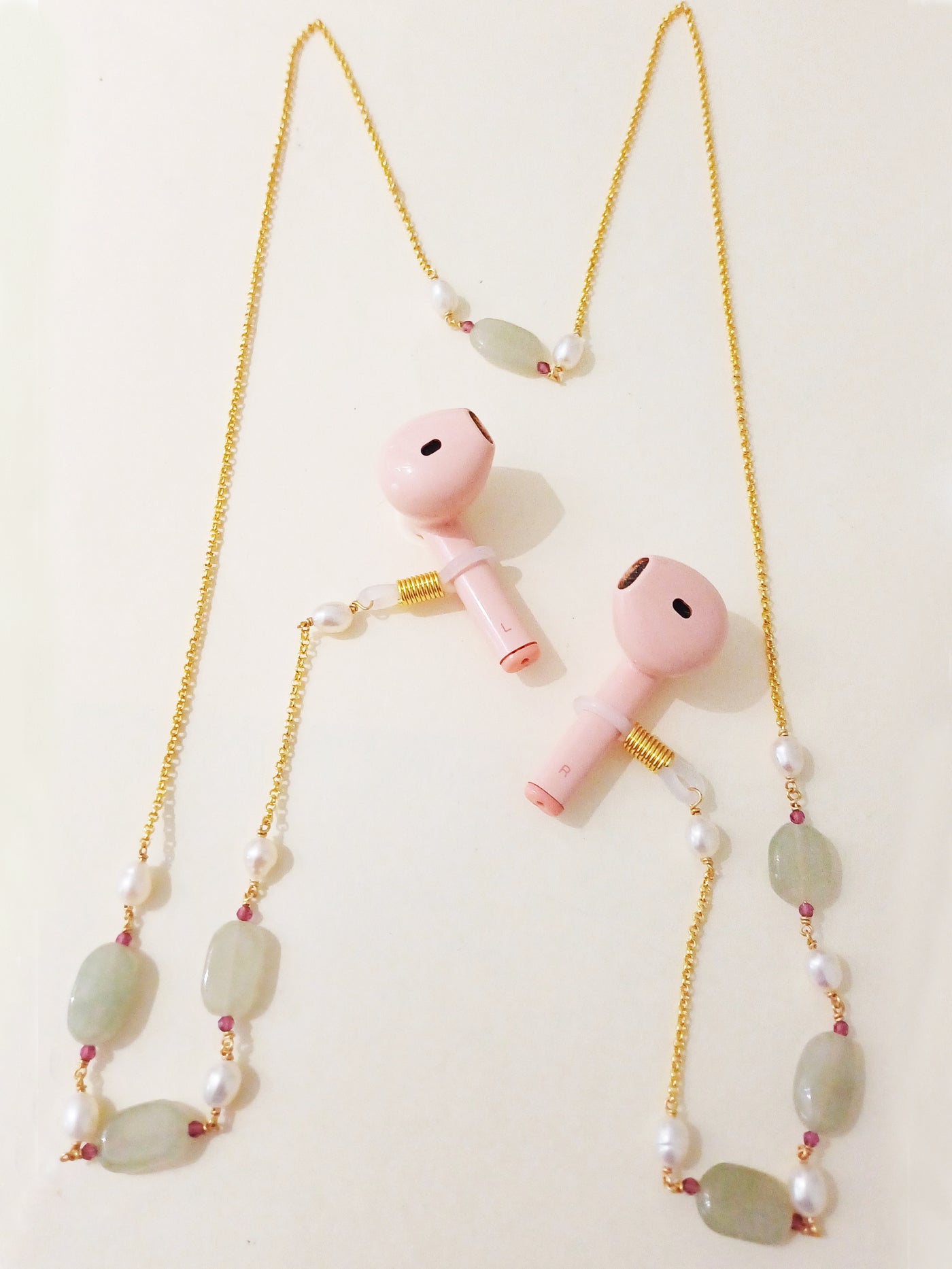 This beautiful piece of jewellery with rice pearls,green aventurines ,dark pink hydro beads,chain and yellow gold plating can be worn with your earpods or eyeglasses adjusting the silicon attachment.