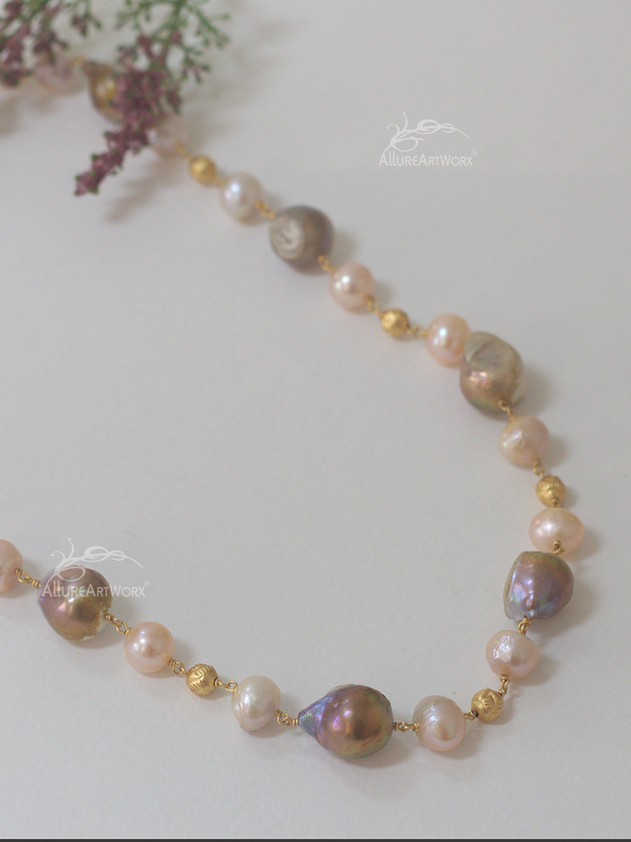 This neckpiece in fresh water baroques with rainbow sheen,light peach fresh water pearls ,matte gold balls can be worn on indowestern and traditional attires.