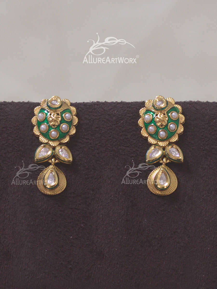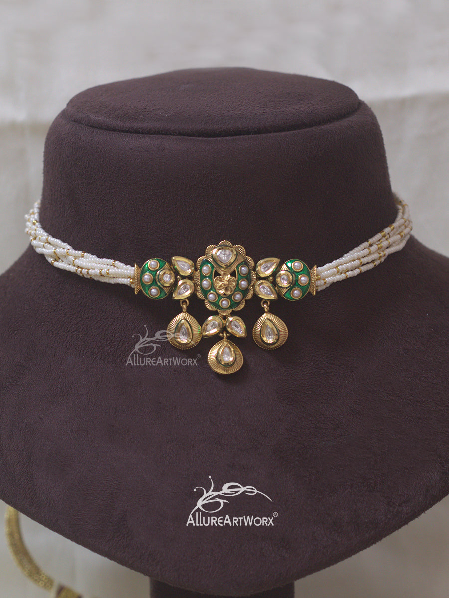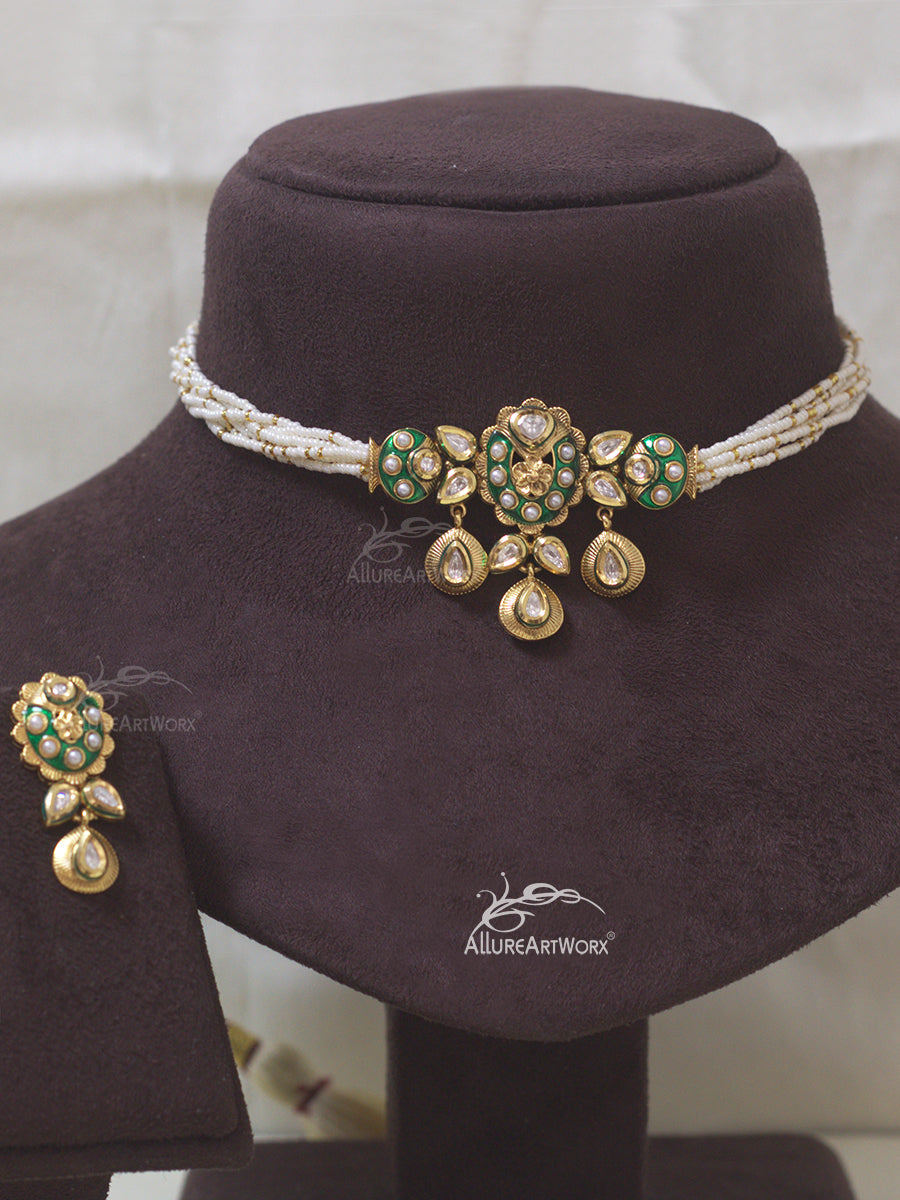 This delicate necklace in pearls, green enamel, kundan with yellow and antique gold plating, can be worn on traditional attire.It is a choker.