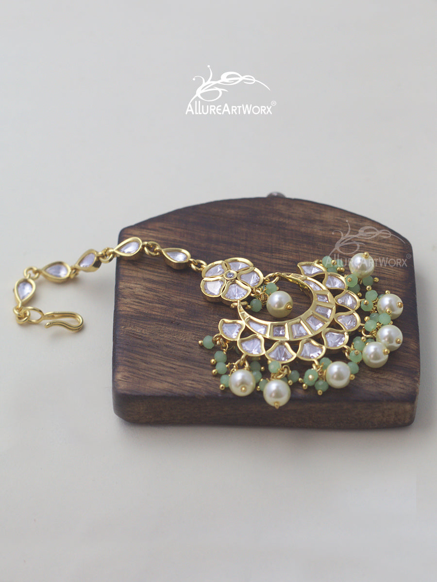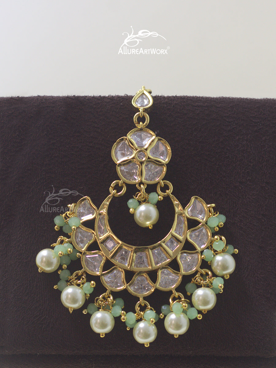 This maangtika with kundan,pastel green beads and pearls can be worn on traditional outfits.
