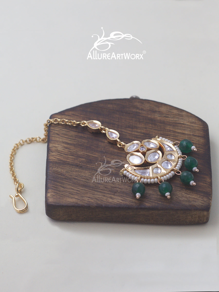 This maangtika with kundan,green beads and pearls can be worn on traditional outfits.