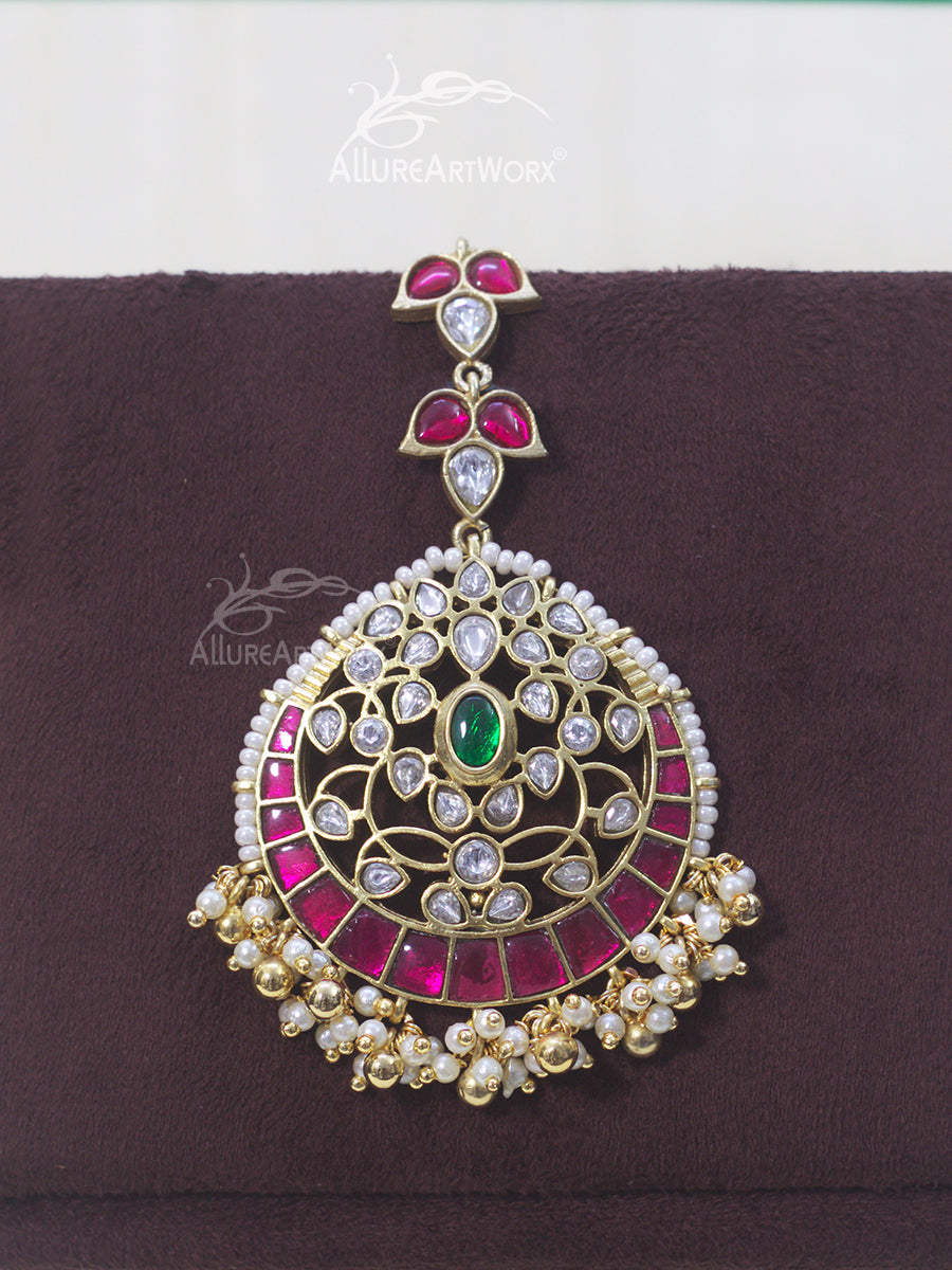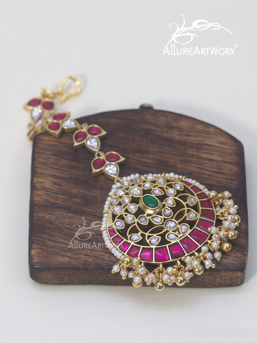 This maangtika with kundan,dark pink-green stones,gold balls and pearls can be worn on traditional outfits