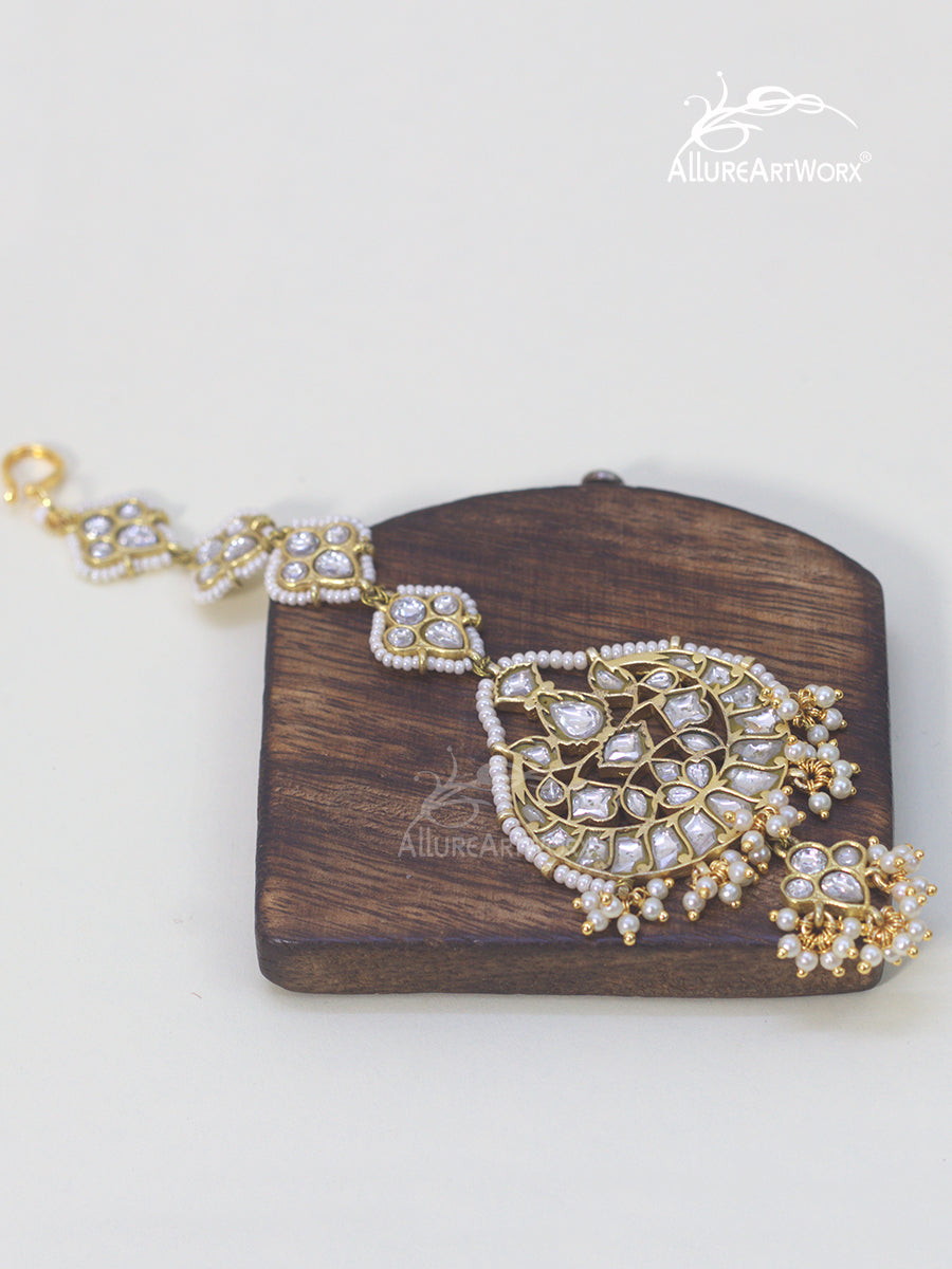 This maangtika with kundan and pearls in light antique finish can be worn on traditional outfits.