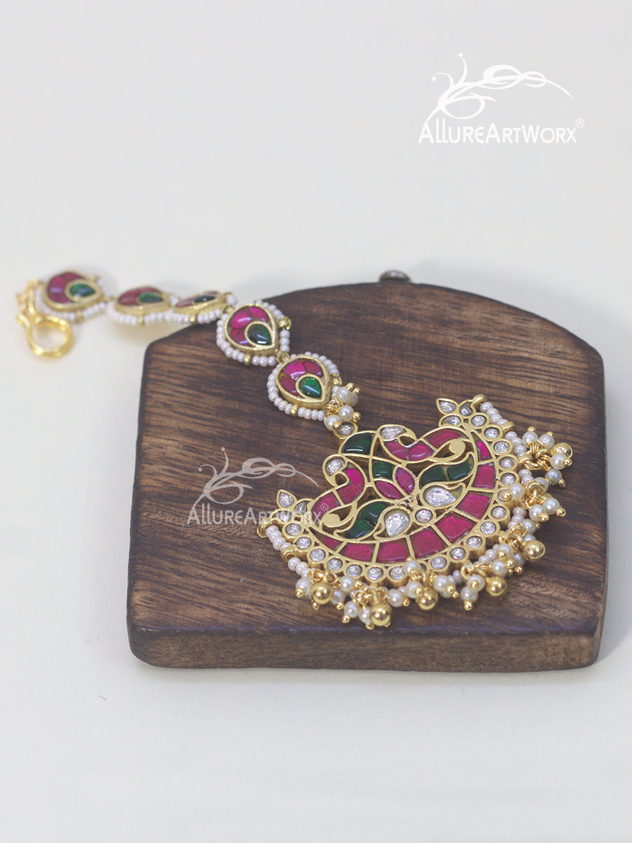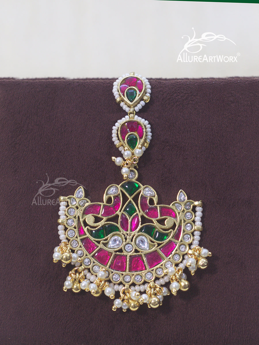 This maangtika with kundan,dark pink-green stones,gold balls and pearls can be worn on traditional outfits