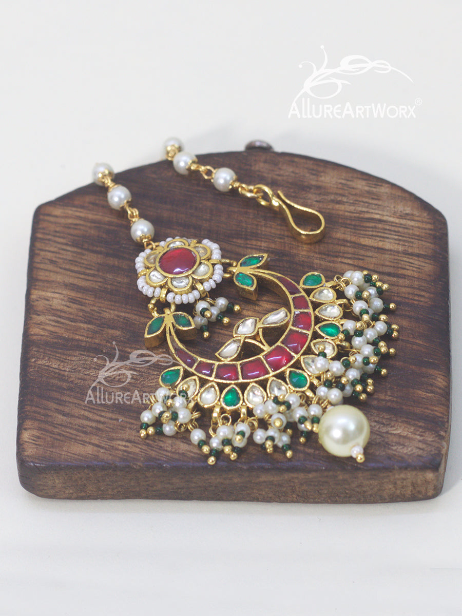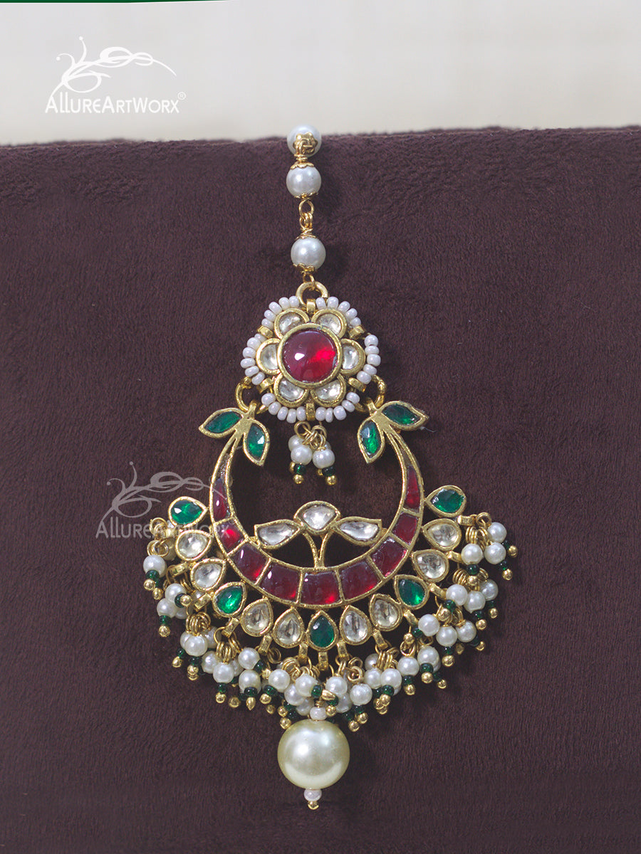 This maangtika with kundan,red-green stones, and pearls can be worn on traditional outfits.