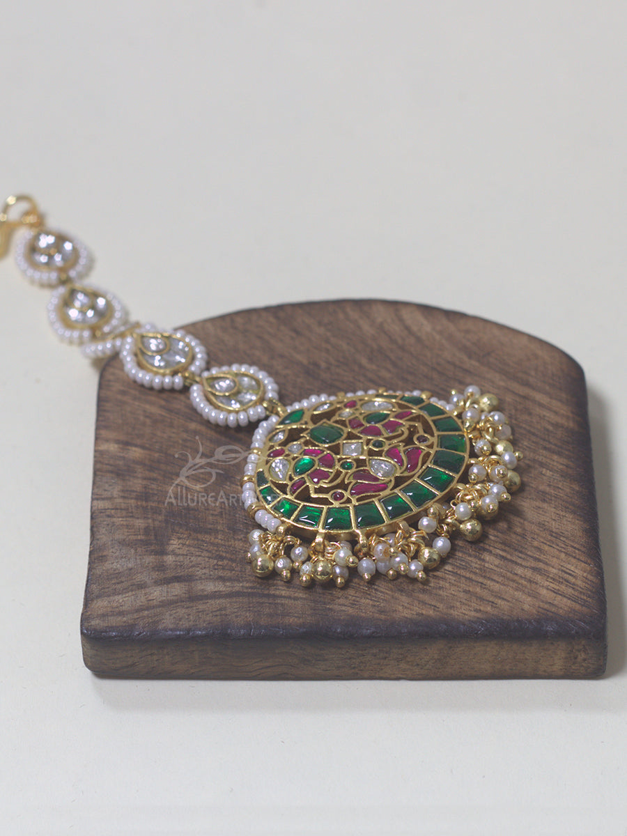 This maangtika with kundan,dark pink-green stones,gold balls and pearls can be worn on traditional outfits