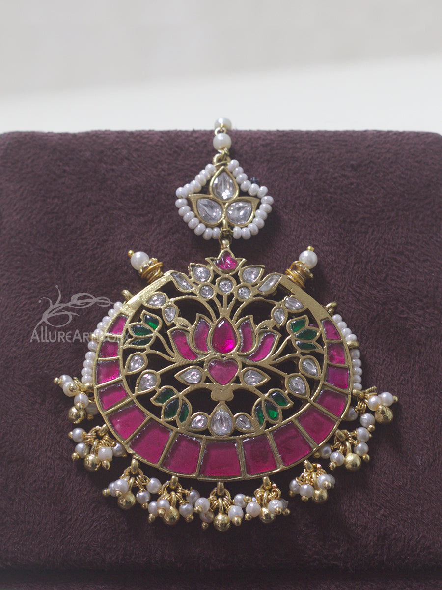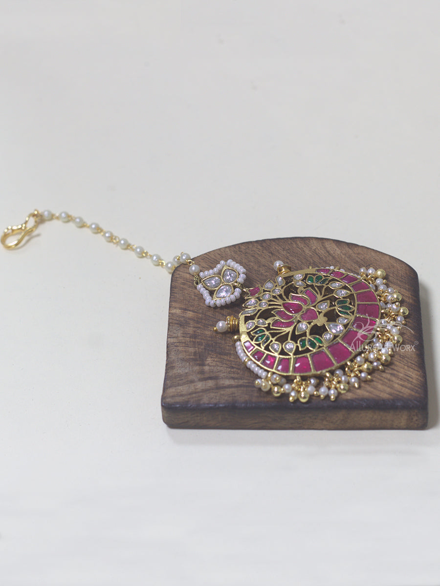 This maangtika with kundan,dark pink-green stones,gold balls and pearls can be worn on traditional outfits