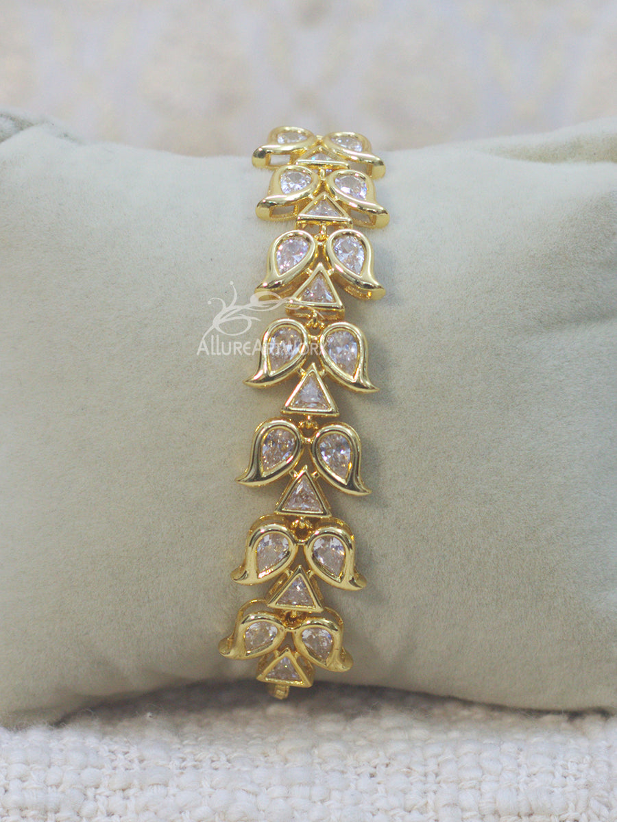 This bracelet with yellow gold finish and uncut czs is adjustable and can be worn on traditional and indowestern outfits.