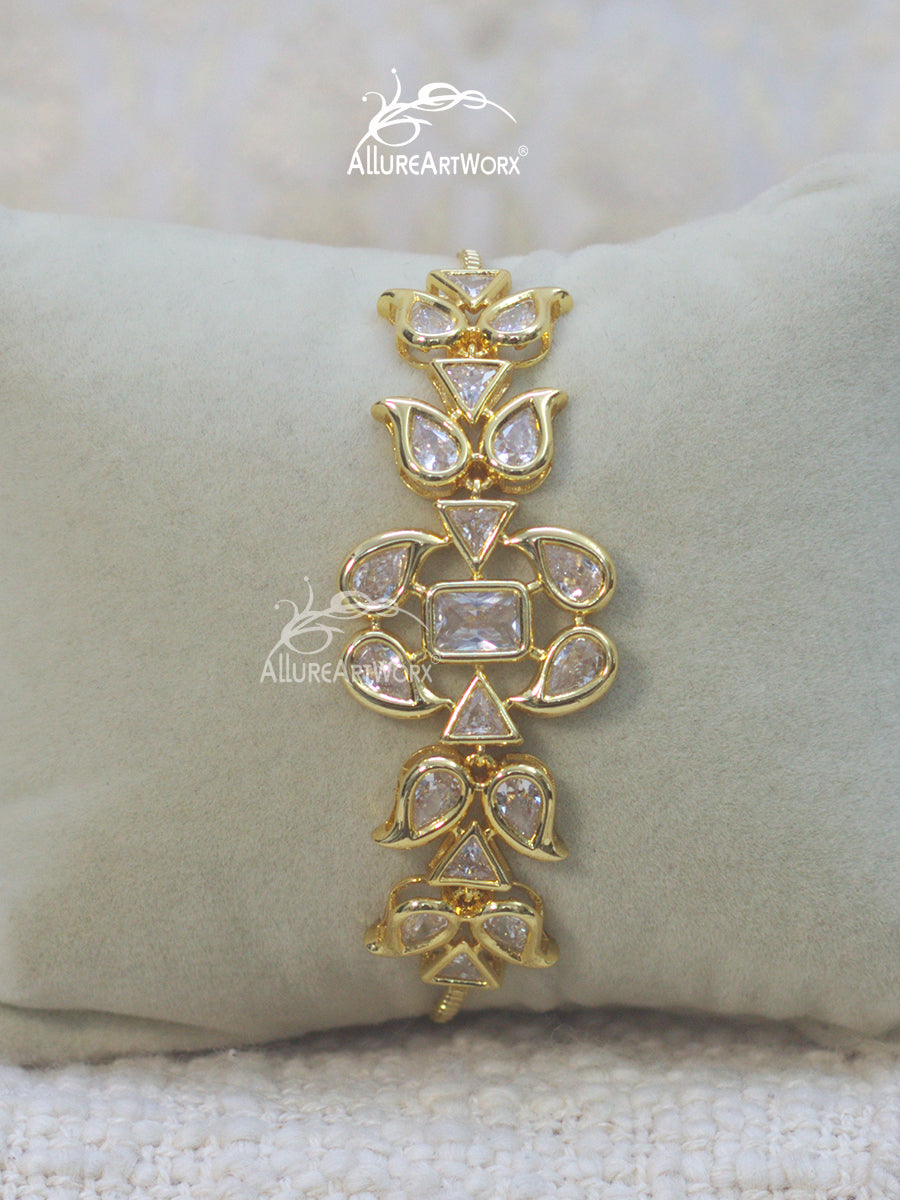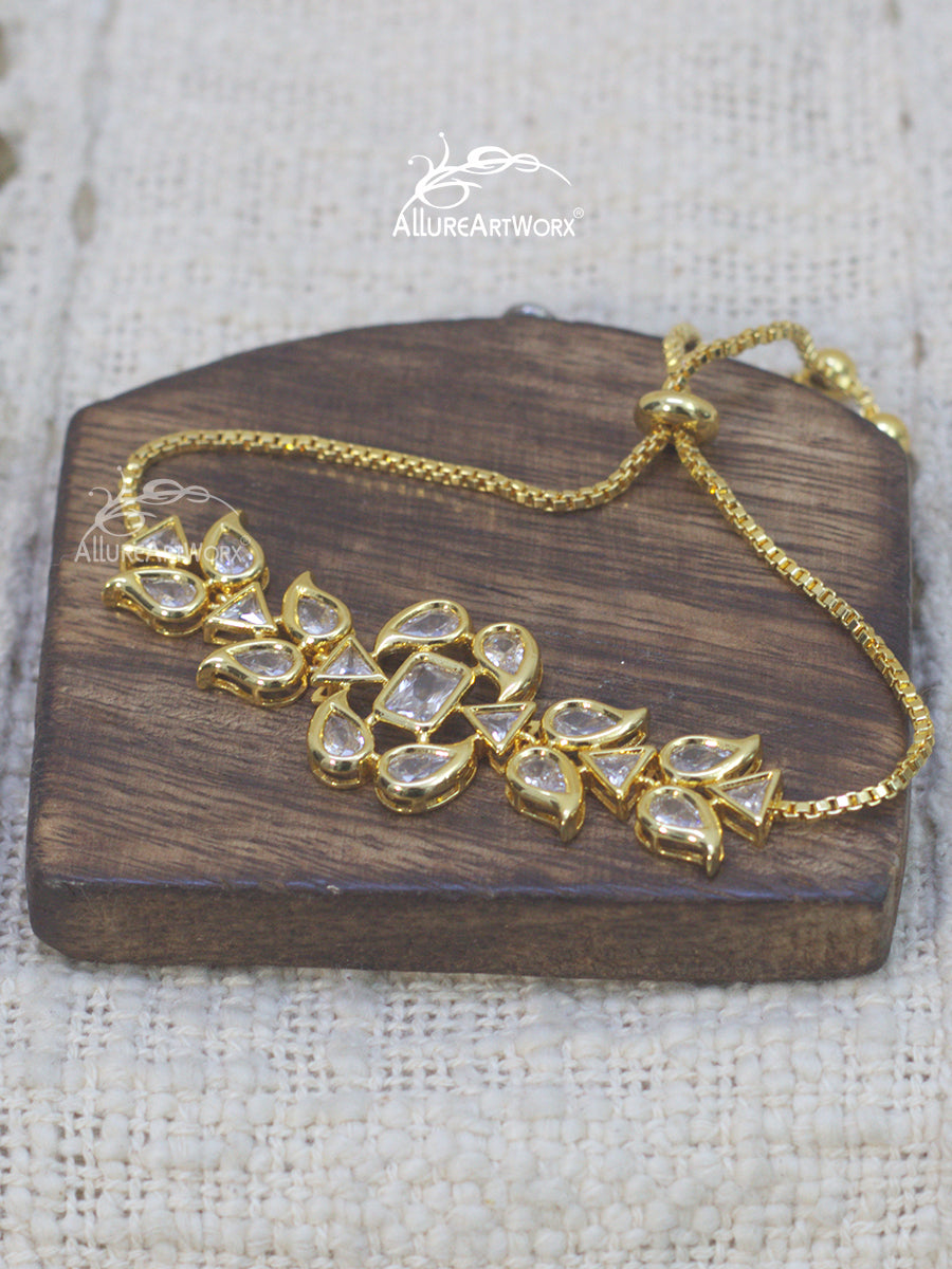 This bracelet with yellow gold finish and uncut czs is adjustable and can be worn on traditional and indowestern outfits.