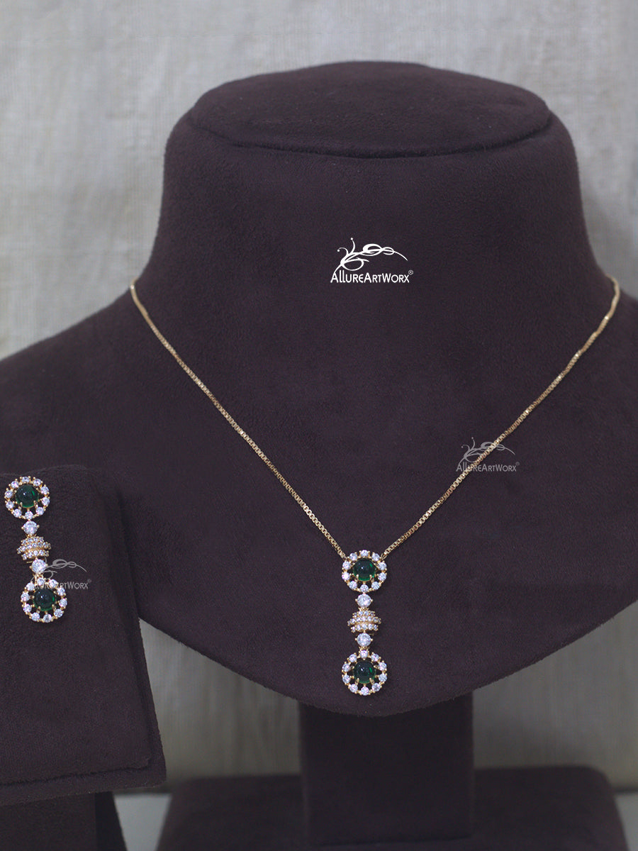 This set in czs and green stones in yellow gold plating can be worn on traditional attire.
