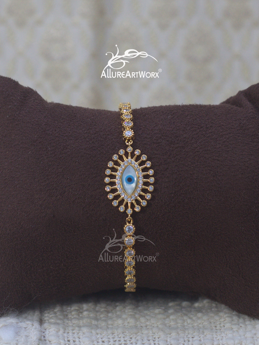 This bracelet with czs,yellow gold plating and evil eye can be worn on casual outfits.