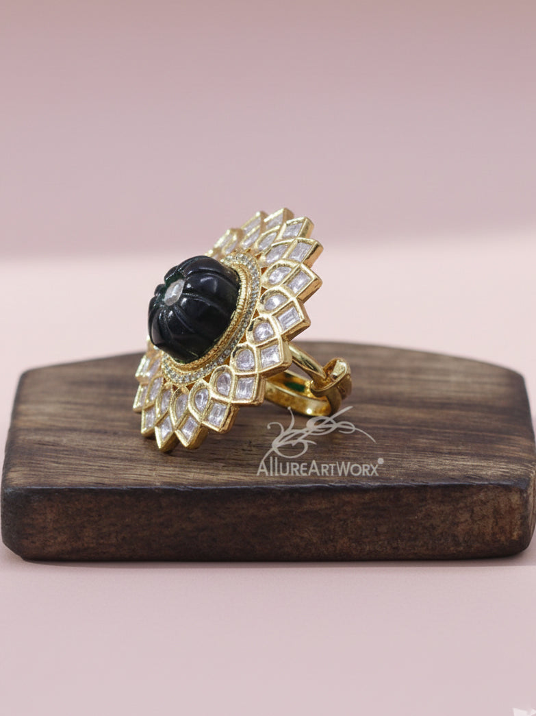 This ring with kundan ,czs and green melon stone in yellow gold plating can be worn on traditional or indowestern outfits.It is adjustable.