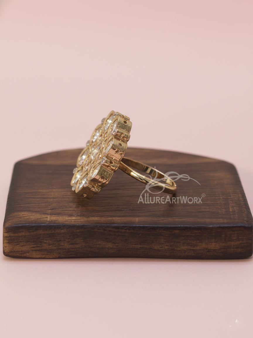 This ring with kundans and yellow gold plating can be worn on traditional or indowestern outfits.It is adjustable.