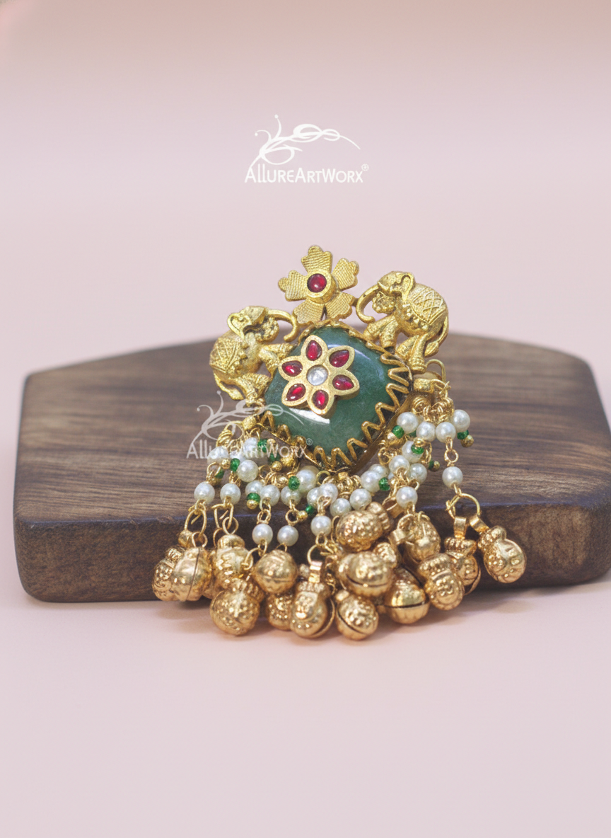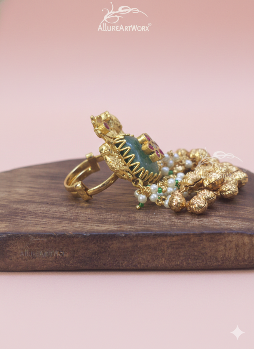 This ring with red -green stones,kundan,ghungroos,pearls and yellow gold plating can be worn on traditional outfits.It is adjustable.