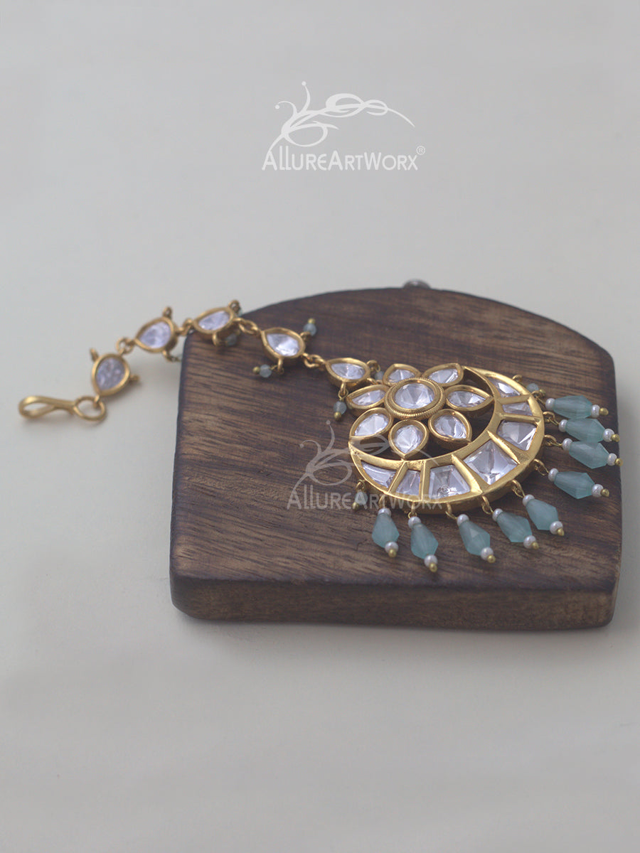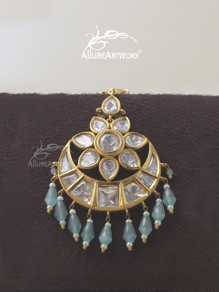 This maangtika with kundan,pastel blue stones and pearls can be worn on traditional outfits.