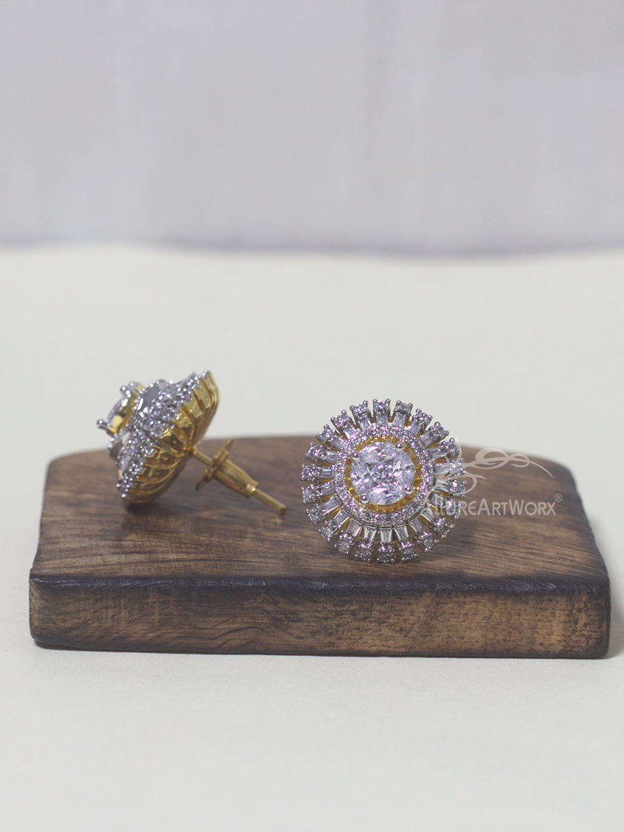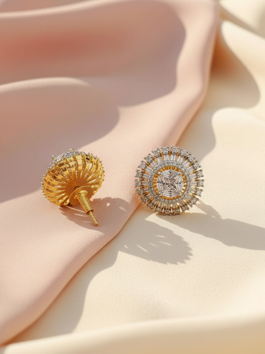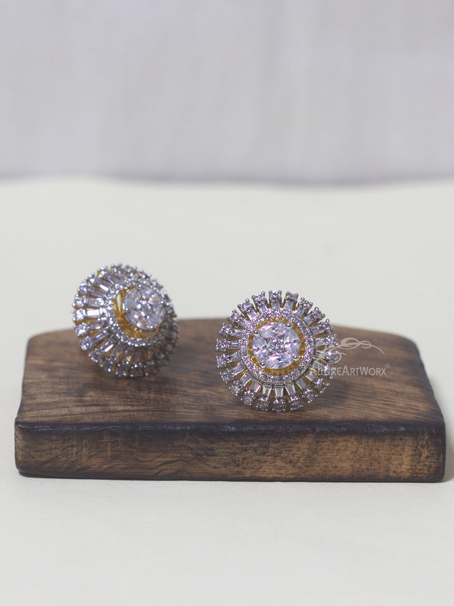 This earrings with tappered bagguettes,round cuts czs in two tone plating(yellow gold and rhodium) can be worn on trendy-casual outfits.