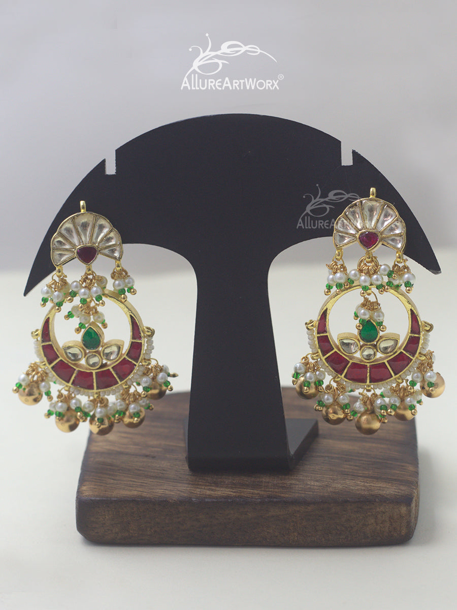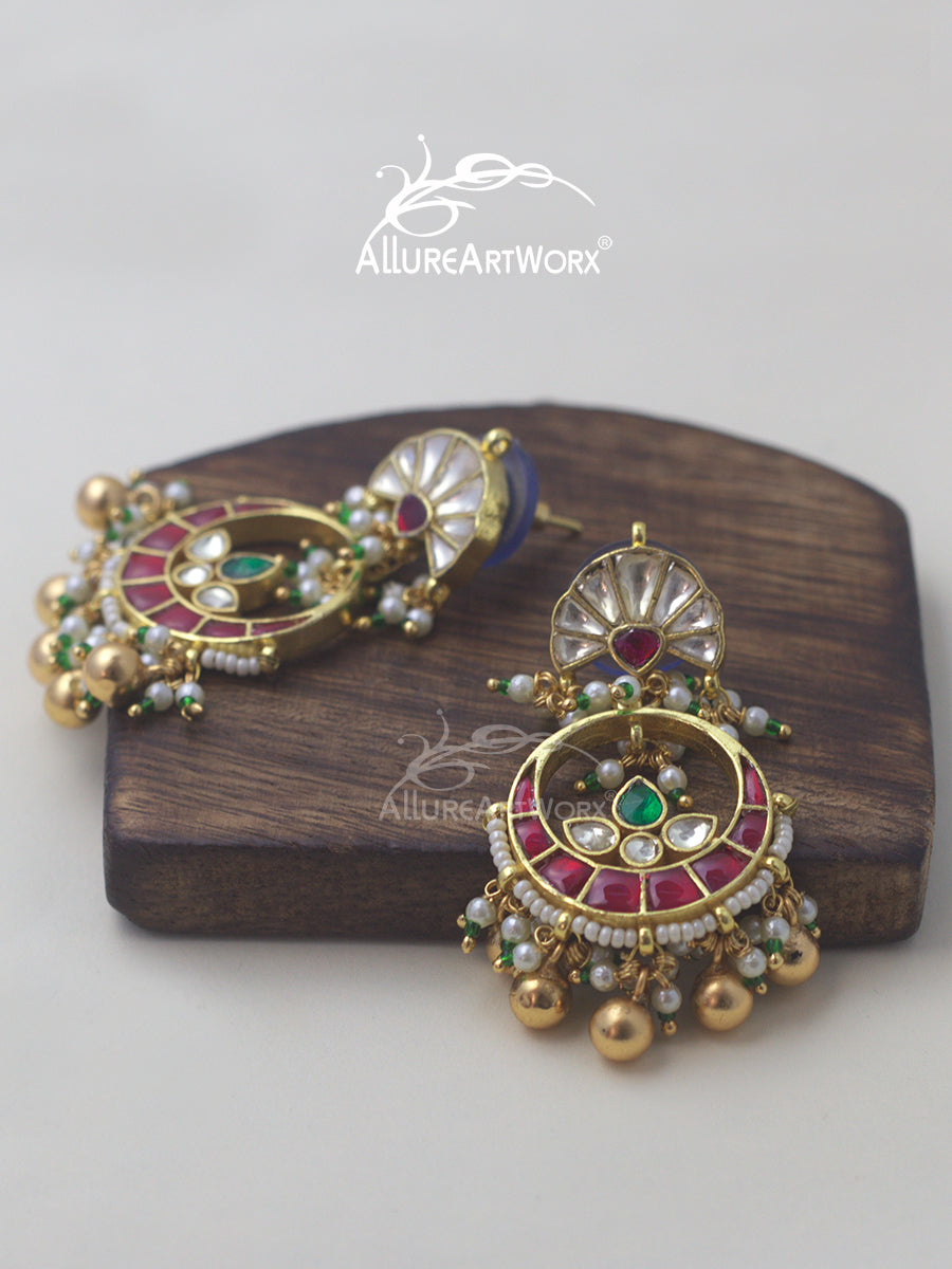 This earrings in yellow kundan,red-green stones,gold balls and pearls can be worn on traditional attire.