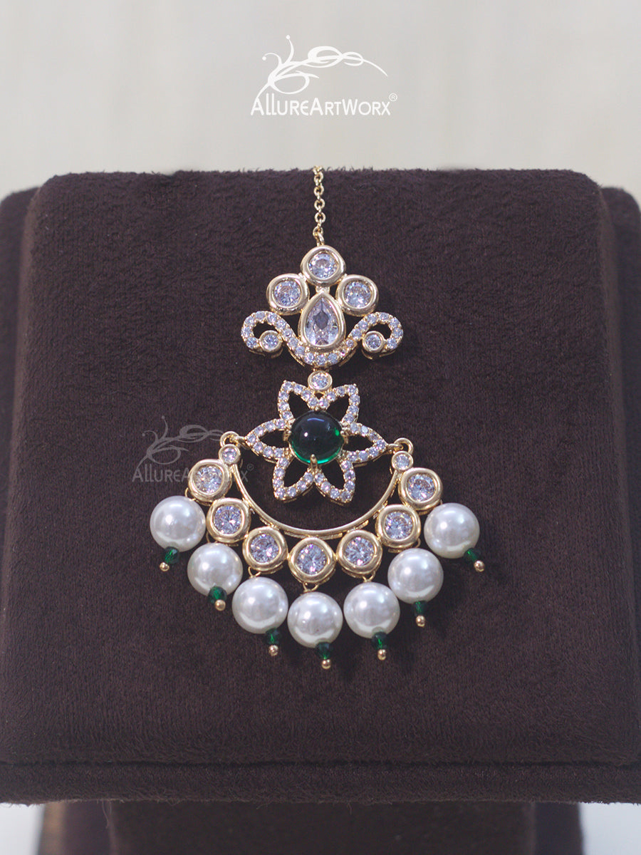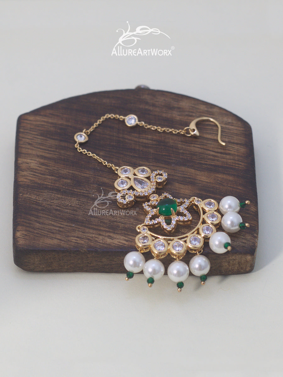 This maangtika with fancy cut czs,green stones,pearls can be worn on traditional outfits or indowestern outfits.