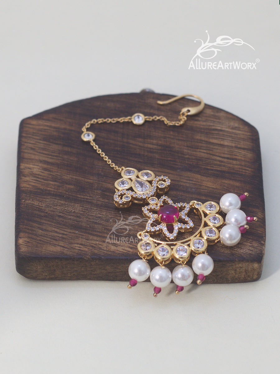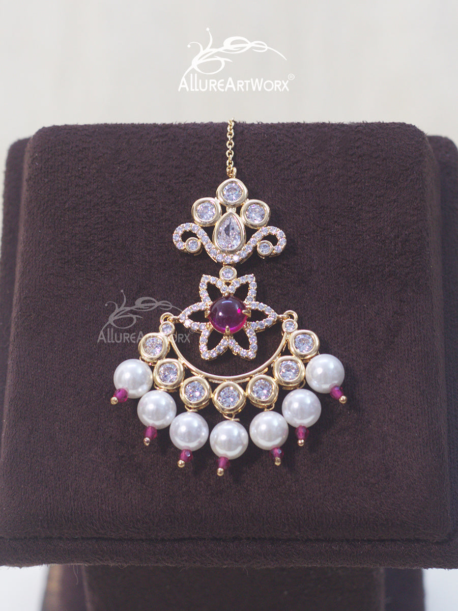 This maangtika with fancy cut czs,dark pink stones,pearls can be worn on traditional outfits or indowestern outfits.