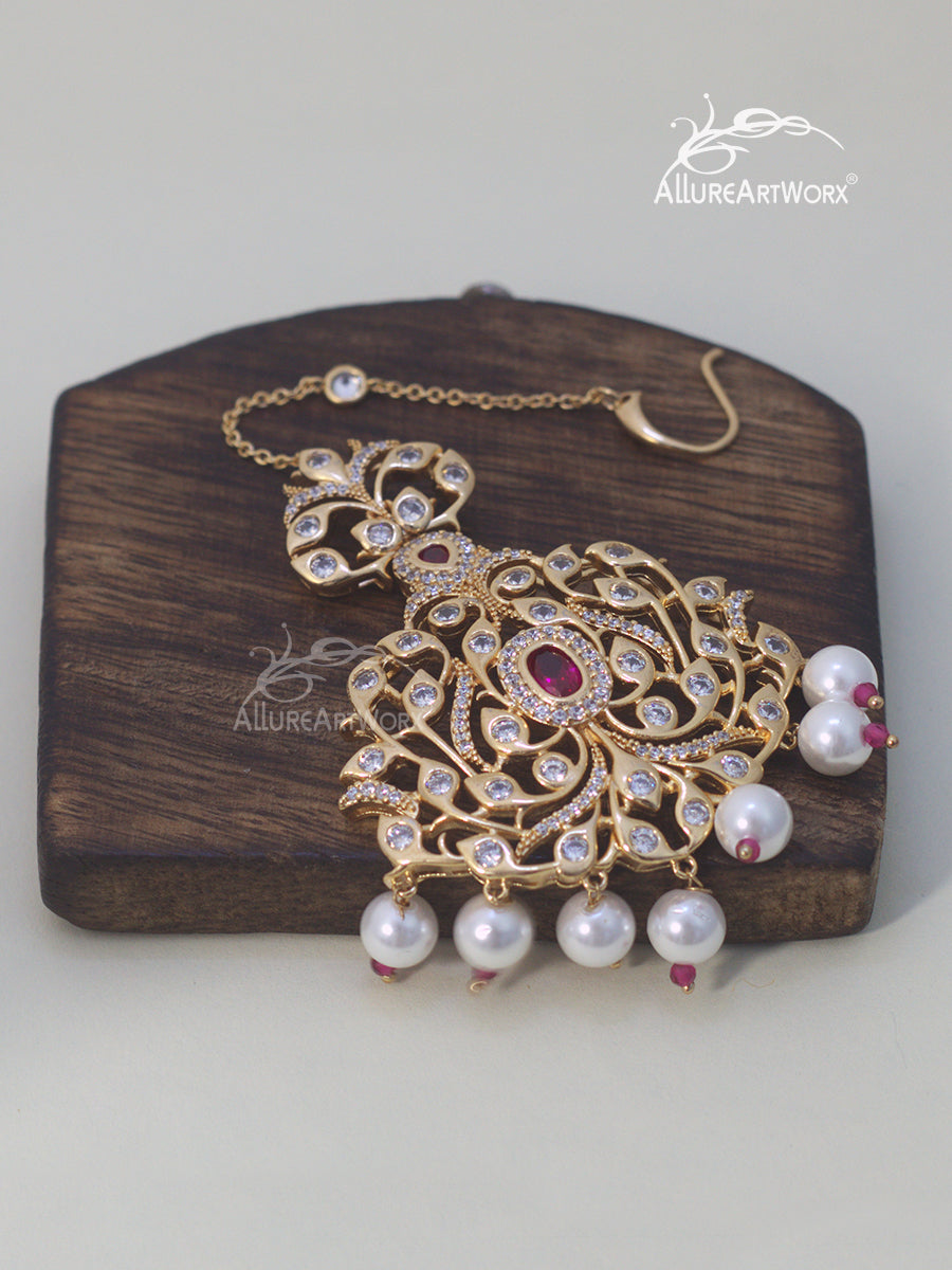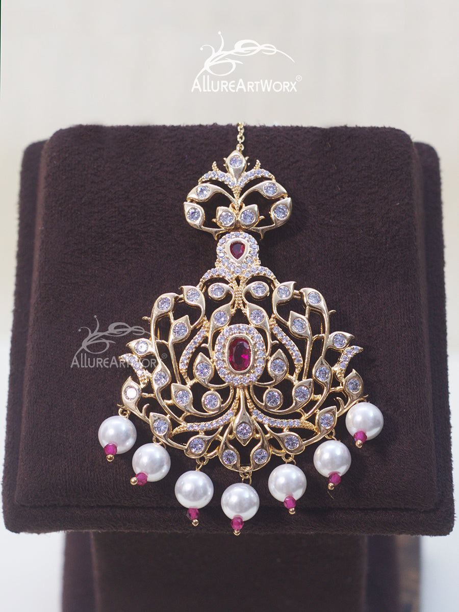 This maangtika with fancy cut czs,dark pink stones,pearls can be worn on traditional outfits or indowestern outfits.