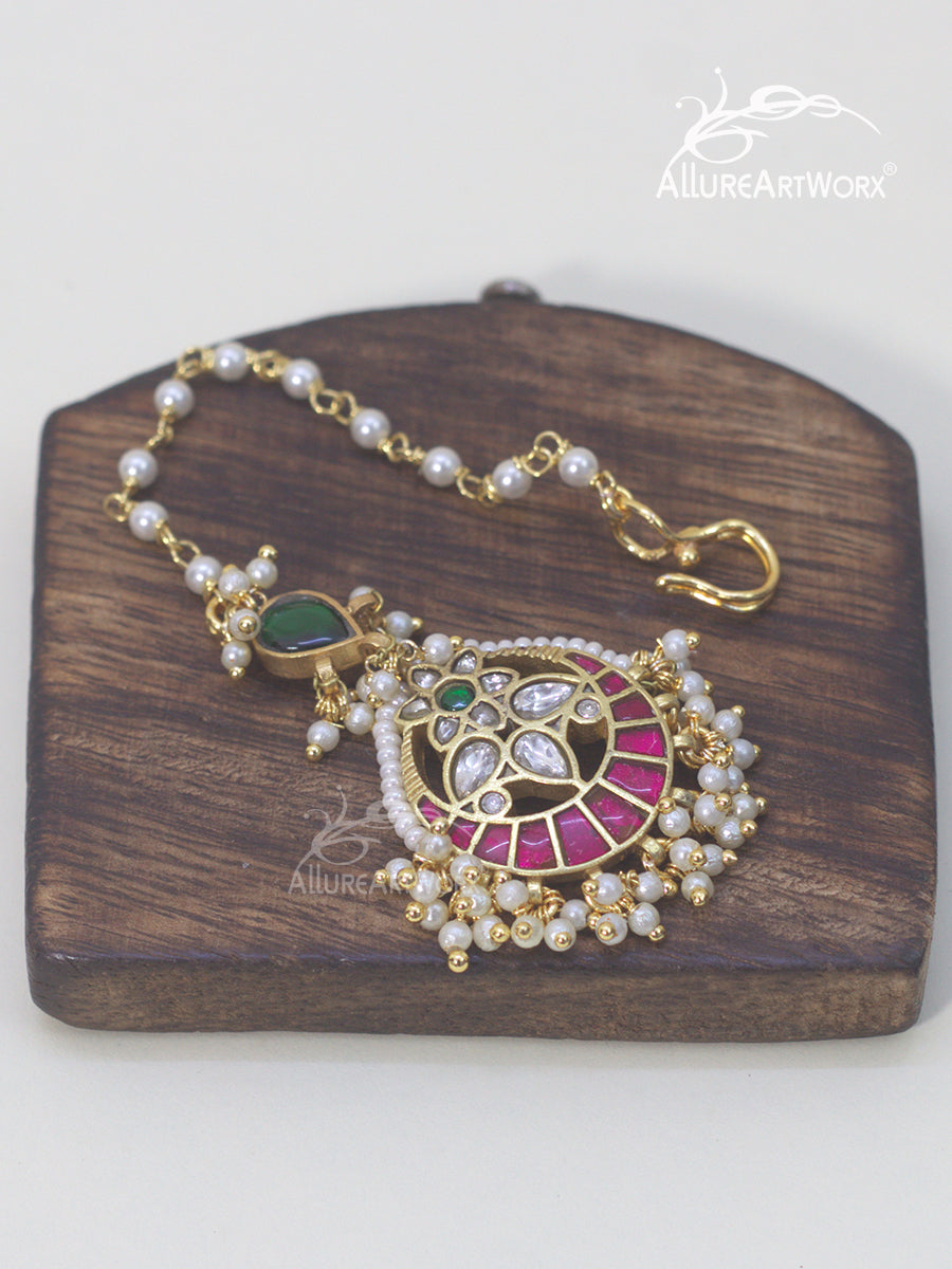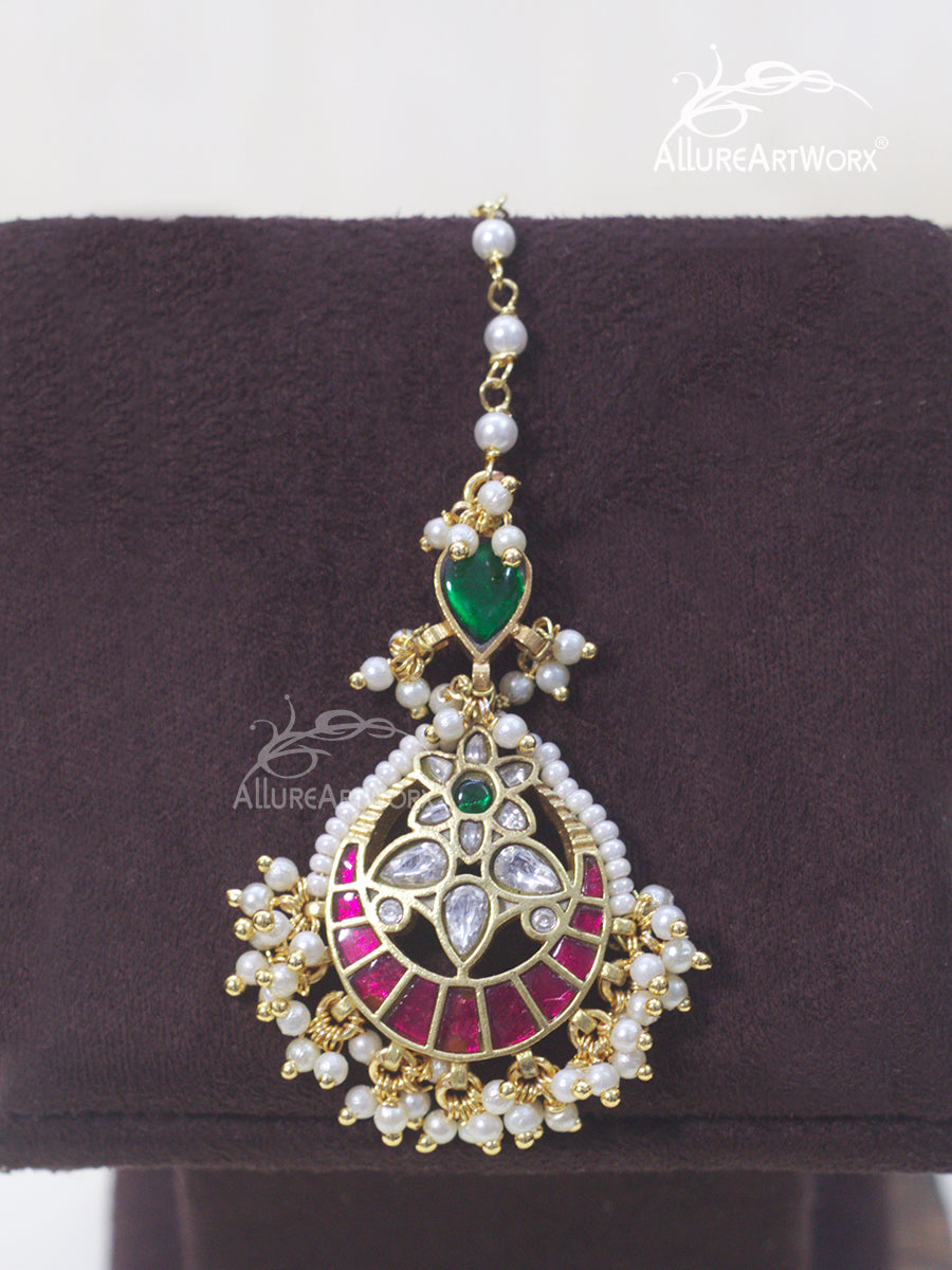 This maangtika with kundan,dark pink-green stones, and pearls can be worn on traditional outfits