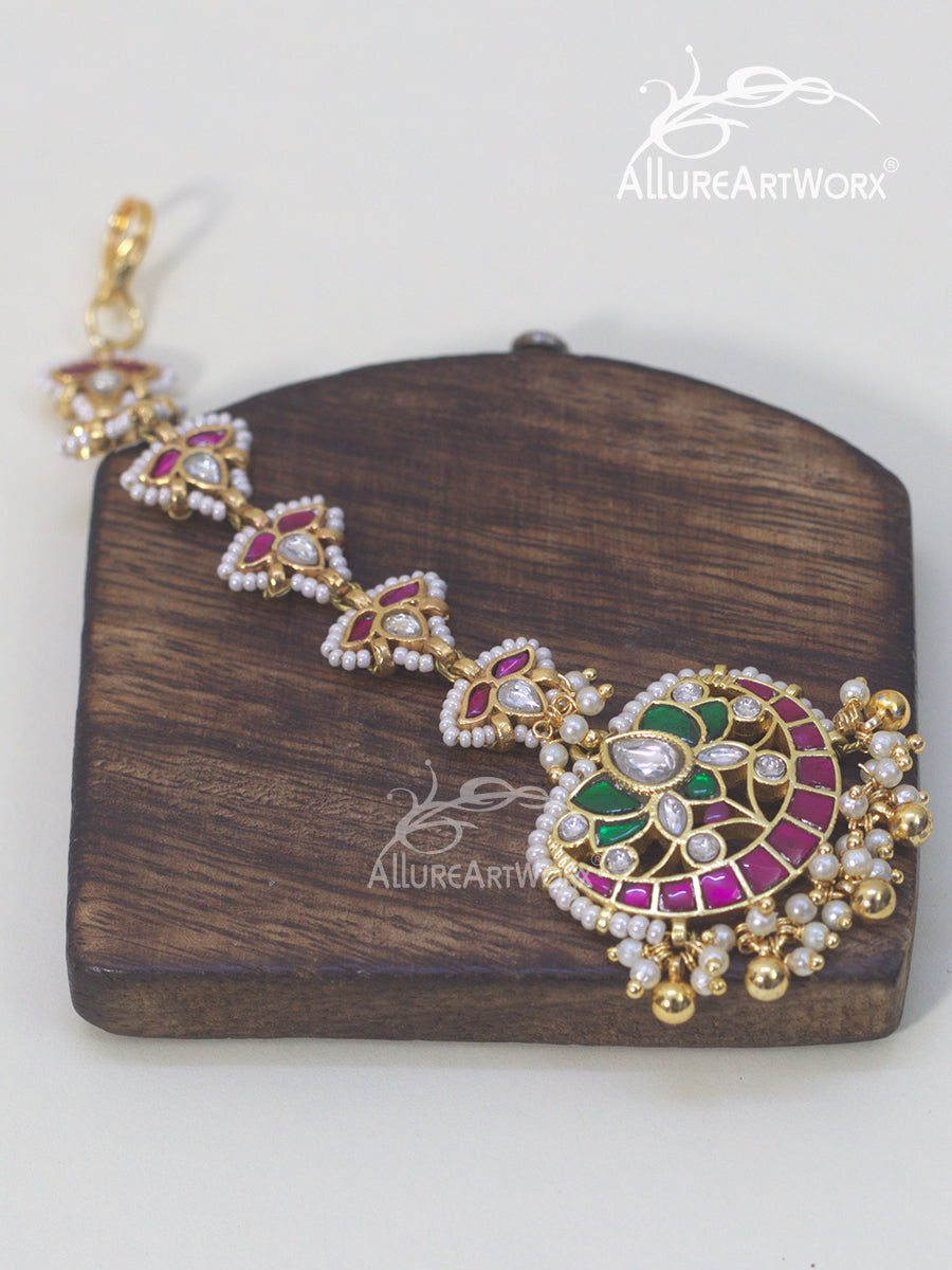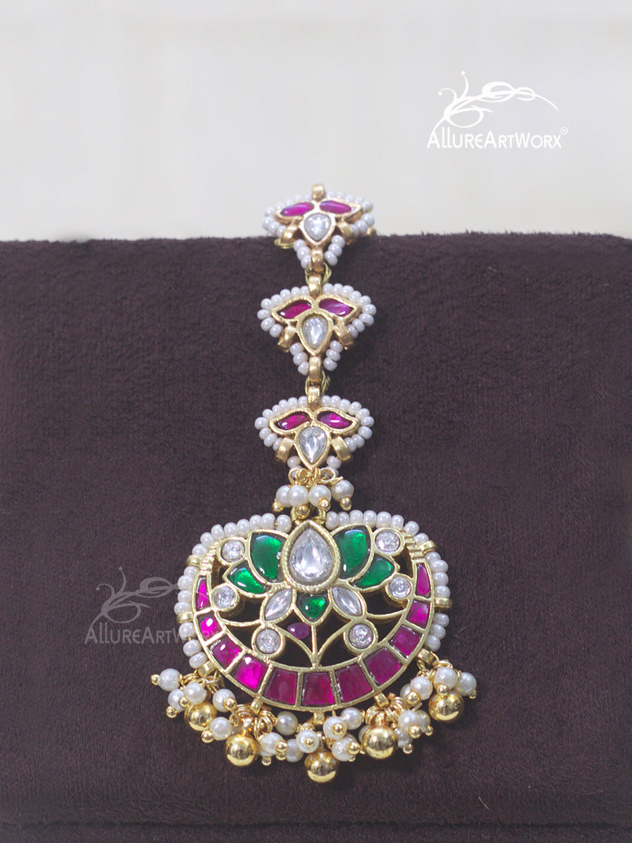 This maangtika with kundan,dark pink-green stones,gold ballsand pearls can be worn on traditional outfits