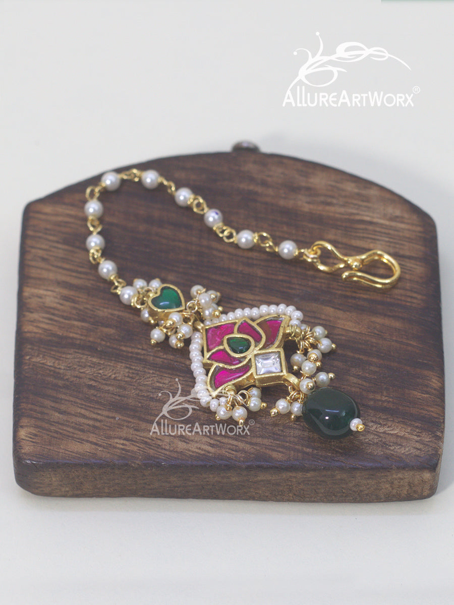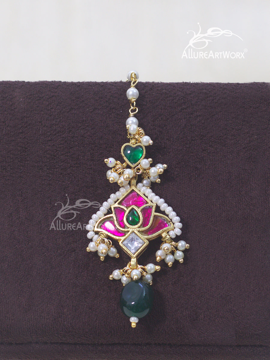 This maangtika with kundan,dark pink-green stones, and pearls can be worn on traditional outfits