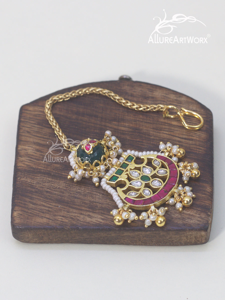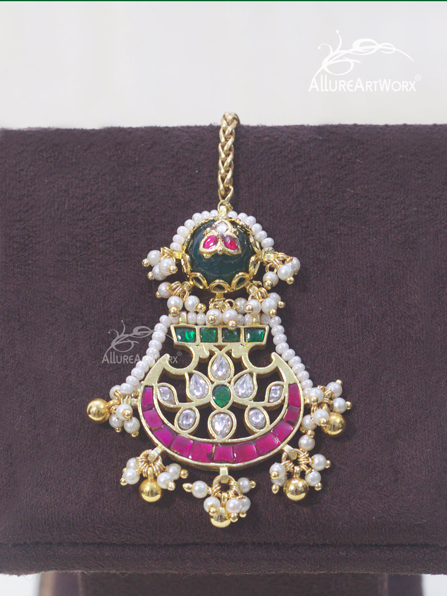 This maangtika with kundan,dark pink-green-red stones,gold ballsand pearls can be worn on traditional outfits