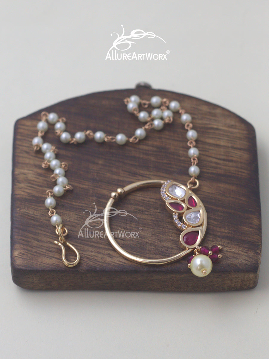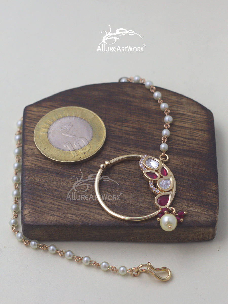 This nosering with kundan, czs,pearl simulants and dark pink stones can be worn on traditional and indo western outfits.it is adjustable.It is press nosering.