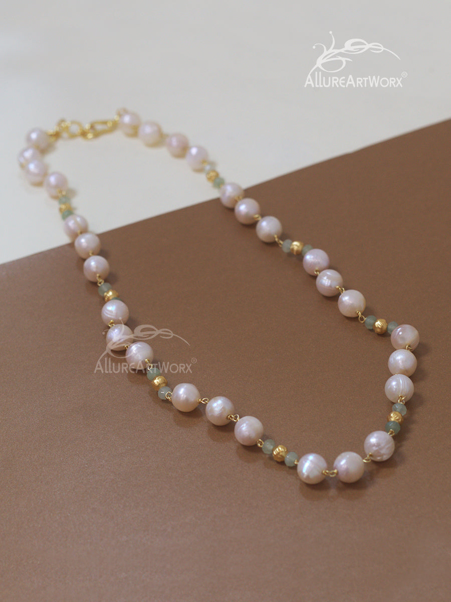 This neckpiece in fresh water pearls in offwhite-very light shade of peach,light green jade with matte gold balls can be worn on indowestern and traditional attires.