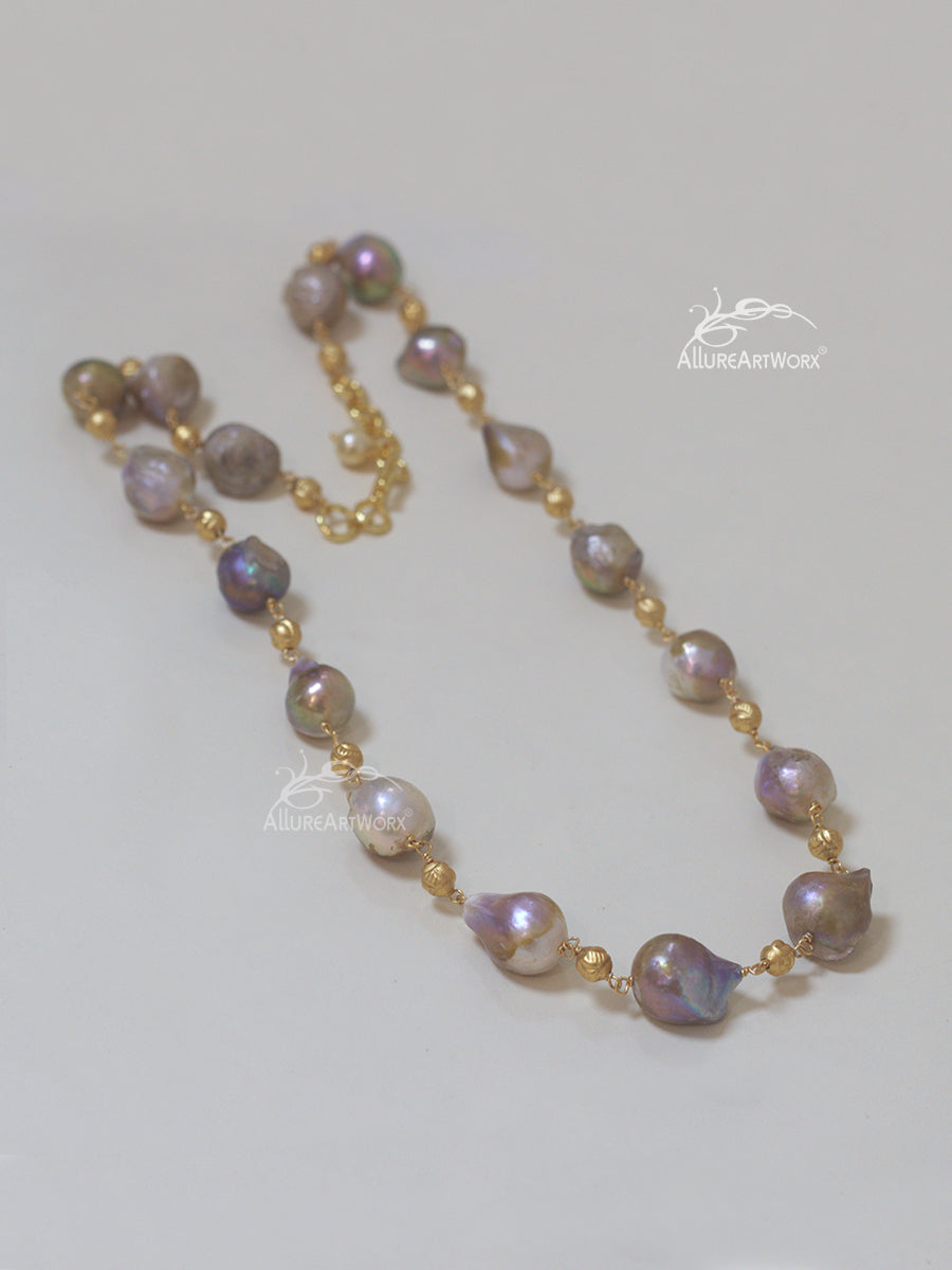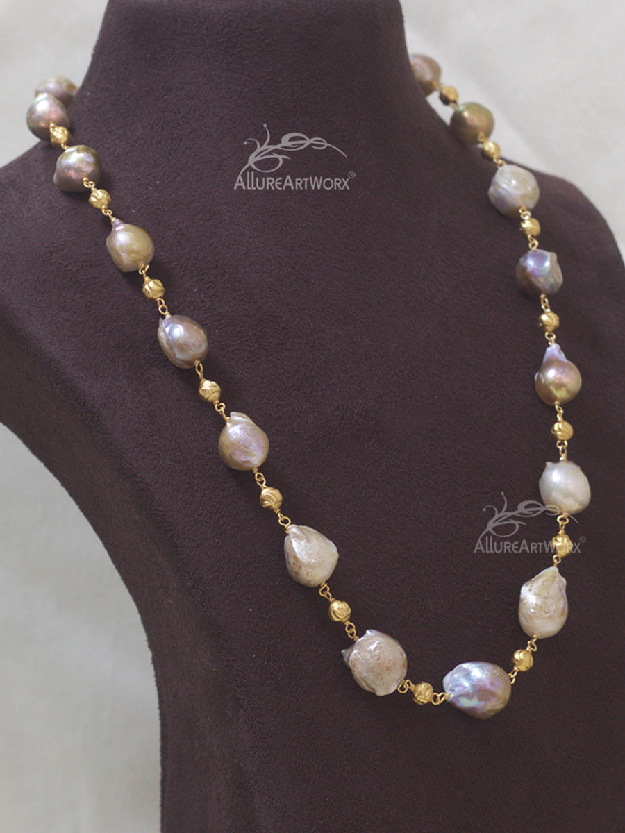 This neckpiece in fresh water baroques with rainbow sheen ,matte gold balls can be worn on indowestern and traditional attires.