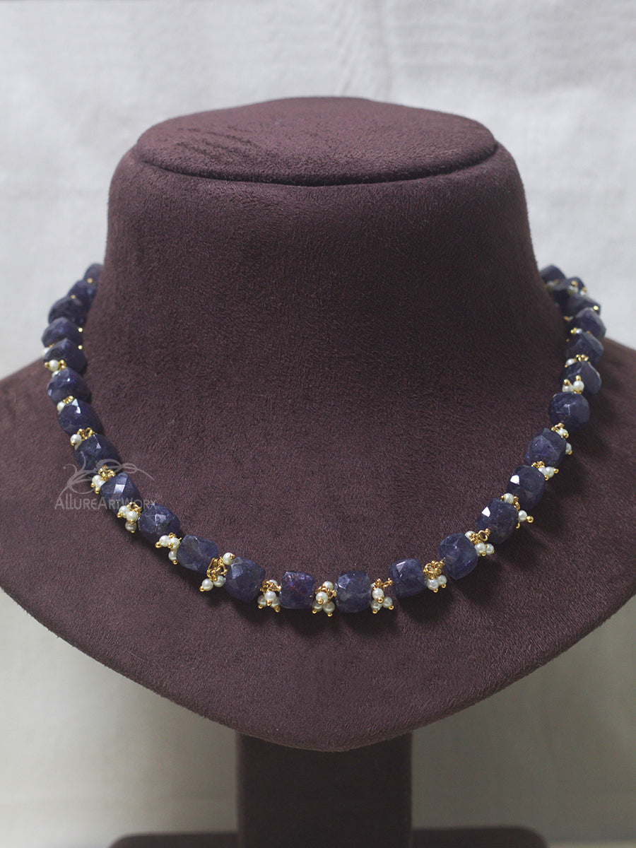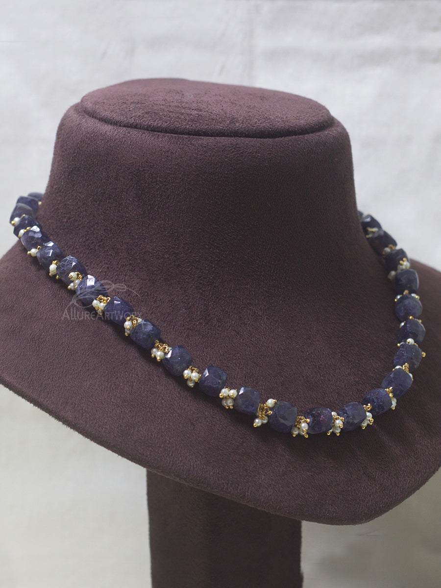 This neckpiece in iolites and pearl simulants can be worn on traditional outfits or indowestern outfits.It can be worn with pearl tops or gold jhumkis.