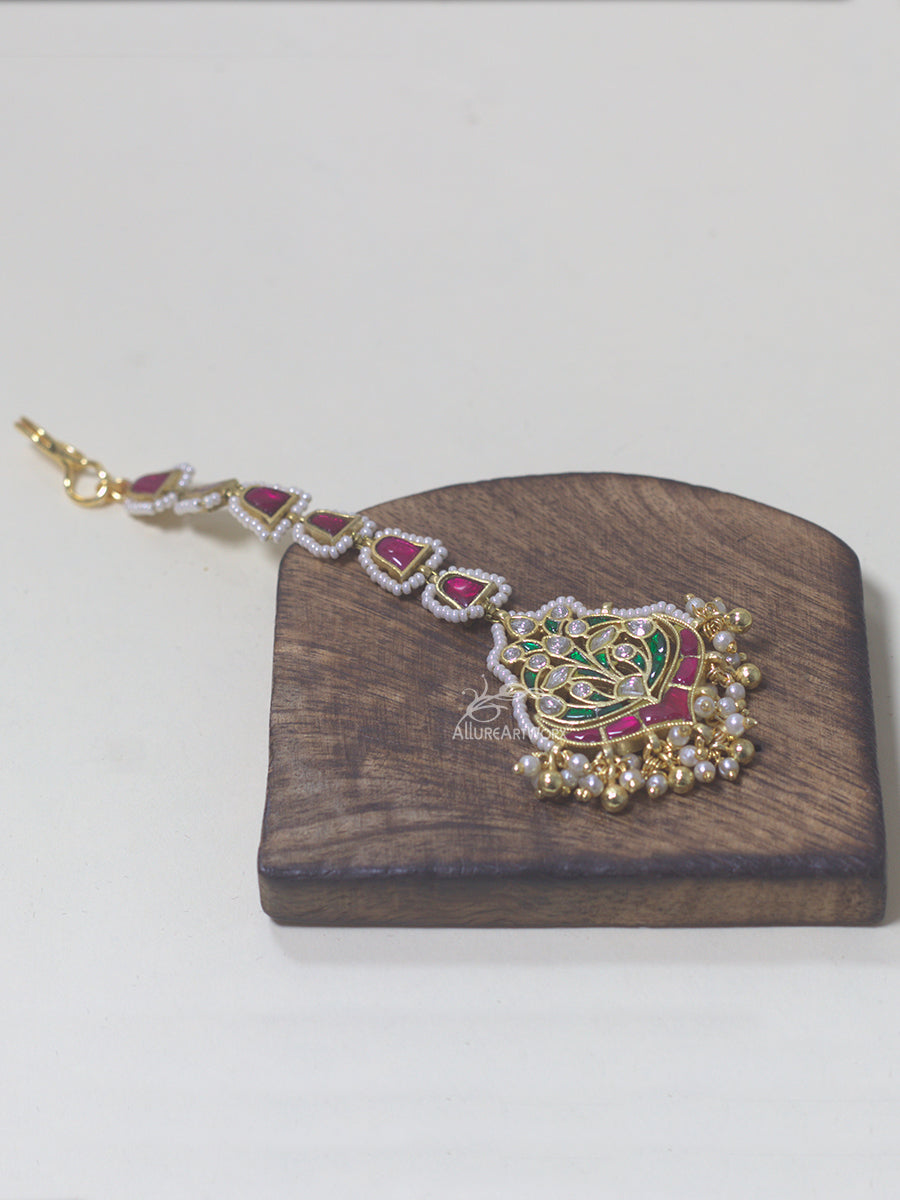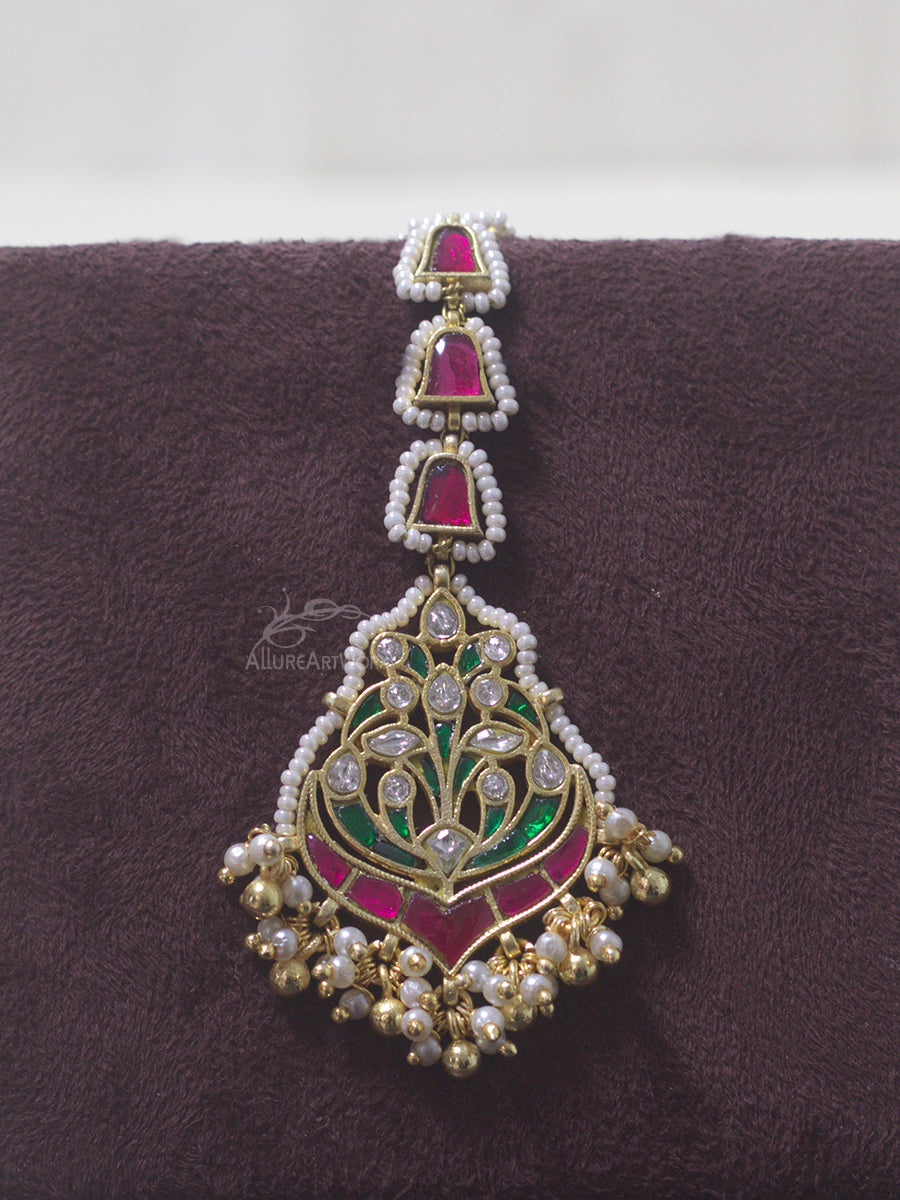 This maangtika with kundan,dark pink-green stones,gold balls and pearls can be worn on traditional outfits